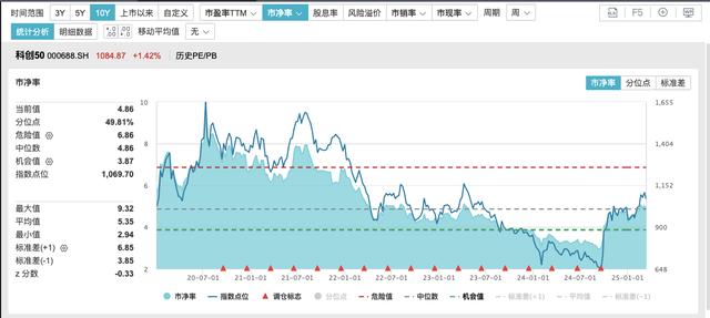 根据Wind数据,截至3月13日,科创50指数市净率为4.86倍,处于十年百分位49.81%,仍具有配置价值。
