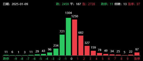 最后简单看下盘面,截至收盘,上证指数跌幅为0.58%,创业板指涨幅为0.11%,港股恒生指数跌幅为0.20%,恒生科技指数涨幅为0.10%,两市成交额缩量至1.1万亿,涨跌基本各半,97家涨停。