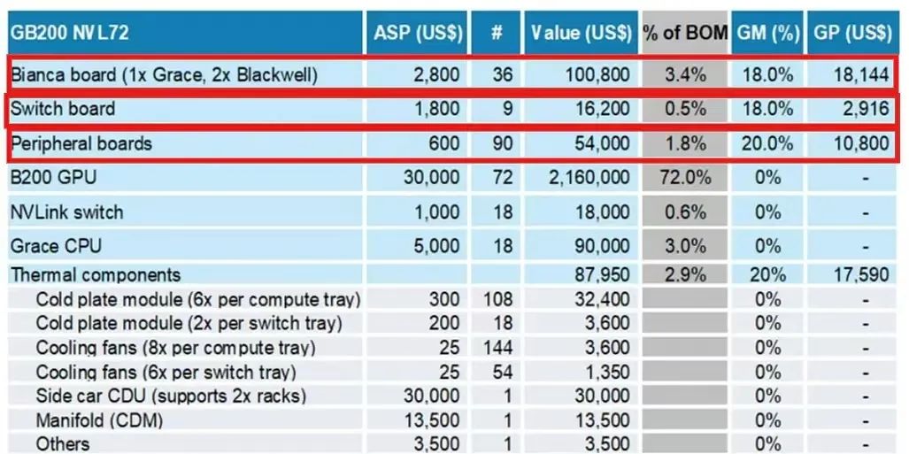 今天一张大摩对GB200各环节价值量测算的报告截图流传甚广,说是一个NVL72机柜的PCB价值量为17.1万美元,仅次于GPU,然后今天A股PCB板块掀起涨停潮。但中午机构出来说17.1万美元是PCBA价值量而非PCB价值量,然后机构吵起来了。