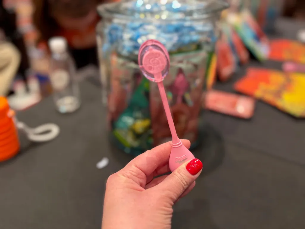 如果说 CES 是严肃技术与怪点子并存的地方,那 Lollipop Star 大概就是后者的典型代表。这不是一颗普通的棒棒糖,而是一款能在你嘴里“播放音乐”的甜点。撕开塑料包装,拿在手里的首先是一根看起来略显“科技感”的棒棒糖:一端是糖,另一端的棍子底部鼓起了一小块,里面藏着电子元件和开机按钮。工作人员提醒,需要配合他们提供的耳塞使用——你一边吃着糖,一边通过骨传导听歌,很难不怀疑这究竟算是零食、玩具,还是某种可穿戴设备的变体。