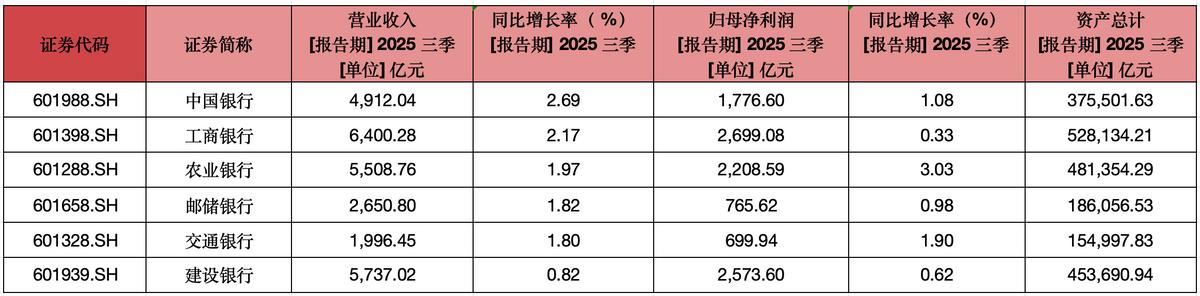 数据显示,2025年前三季度,中国银行、工商银行、农业银行、邮储银行、交通银行和建设银行分别实现营业收入4912.04亿元、6400.28亿元、5508.76亿元、2650.8亿元、1996.45亿元和5737.02亿元,分别同比增长2.69%、2.17%、1.97%、1.82%、1.80%和0.82%。