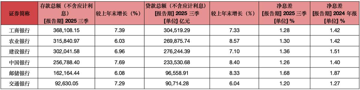 截至2025年三季度末,六大行资产规模合计达到217.97万亿,较上年末增长9.16%。其中,贷款总额为127.14万亿,较上年末增长8.54%;存款总额为149.76万亿,较上年末增长6.92%。