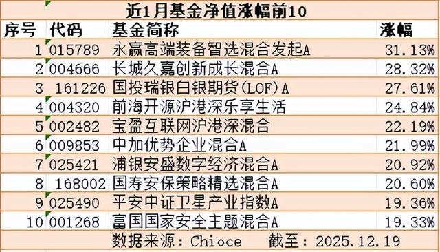 如果将将时间段拉长到近1个月,可以发现,截至10月19日,净值涨幅靠前的TOP10基金中,也是以科技成长主题居多。这里,对于同一基金的A、C产品,仅选涨幅较大者;同一公司上榜产品与其他基金业绩相近,选择其他基金。