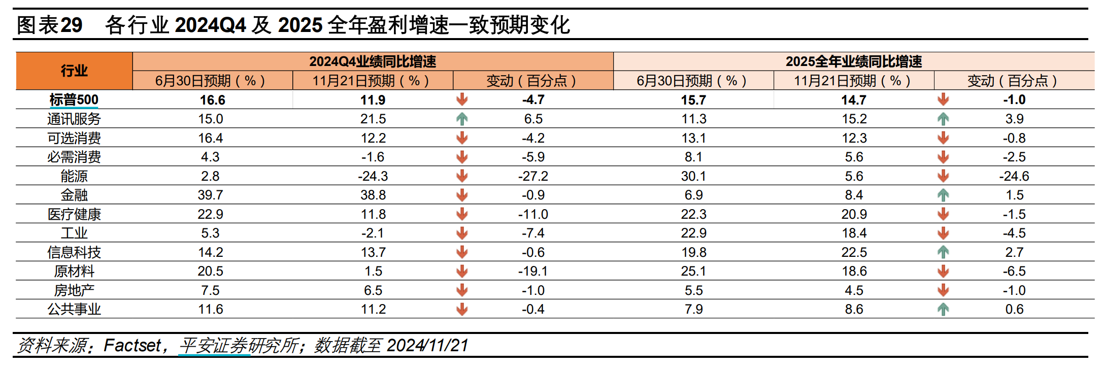 根据平安证券整理的业绩预测情况,可以看到机构近期虽然下修了标普500的2025年同比业绩增速,但依旧在15%左右的高增速,从细分行业来看,甚至还上调信息科技的同比增速至22.5%。