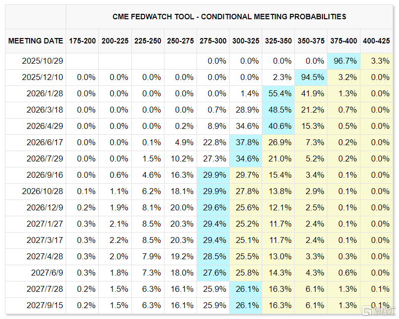 据CME“美联储观察”:美联储10月降息25个基点的概率为96.7%,维持利率不变的概率为3.3%。美联储12月累计降息50个基点的概率为94.5%。