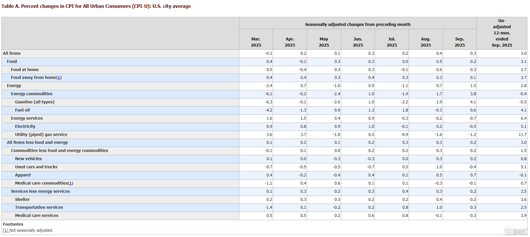 根据美国劳工统计局今晚公布的数据,美国9月CPI同比上涨3%,为2025年1月以来新高,低于市场预期的3.1%,前值2.9%;环比上涨0.3%,同样低于预期的0.40%,前值0.40%。