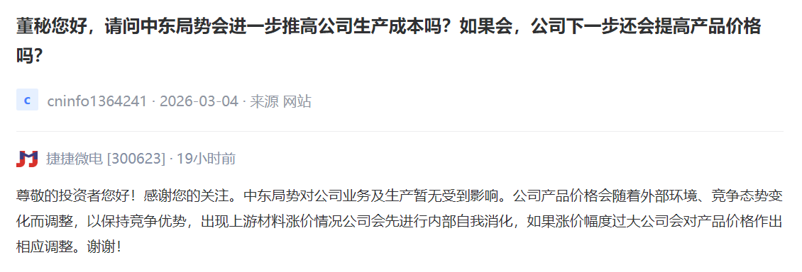 捷捷微电 [300623] :中东局势对公司业务及生产暂无受到影响。公司产品价格会随着外部环境、竞争态势变化而调整,以保持竞争优势,出现上游材料涨价情况公司会先进行内部自我消化,如果涨价幅度过大公司会对产品价格作出相应调整。