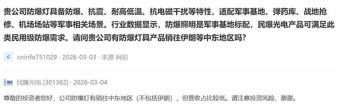 民爆光电 [301362] :公司防爆灯有销往中东地区(不包括伊朗),但营收占比较低。