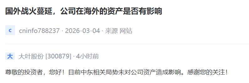 大叶股份 [300879] :目前中东相关局势未对公司资产造成影响。