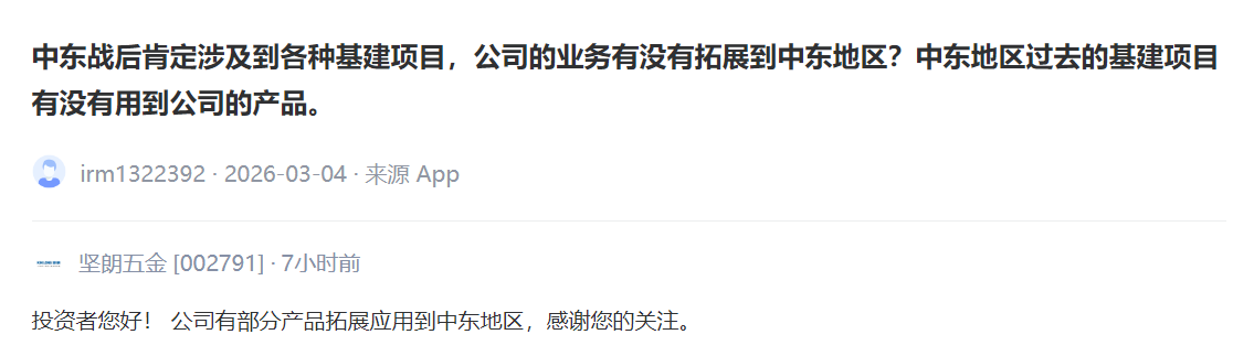 坚朗五金 [002791] :公司有部分产品拓展应用到中东地区。