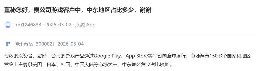 神州泰岳 [300002] :公司的游戏产品通过Google Play、App Store等平台向全球发行,市场遍布150多个国家和地区。营收上主要以美国、日本、韩国、中国大陆等市场为主,中东地区营收占比较低。
