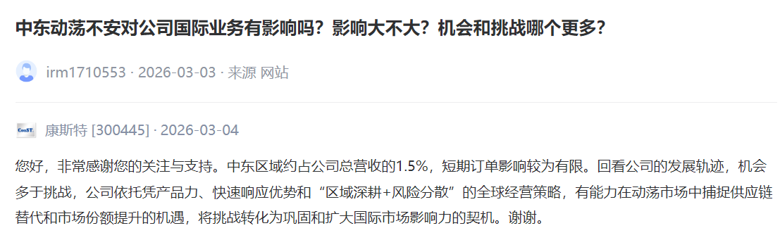 康斯特 [300445] :中东区域约占公司总营收的1.5%,短期订单影响较为有限。回看公司的发展轨迹,机会多于挑战,公司依托凭产品力、快速响应优势和“区域深耕+风险分散”的全球经营策略,有能力在动荡市场中捕捉供应链替代和市场份额提升的机遇,将挑战转化为巩固和扩大国际市场影响力的契机。