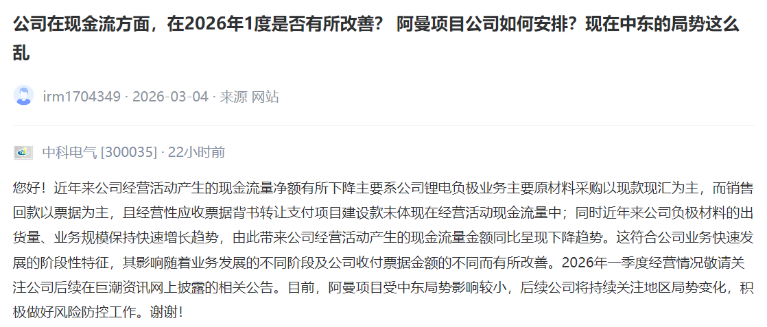 中科电气 [300035] :近年来公司经营活动产生的现金流量净额有所下降主要系公司锂电负极业务主要原材料采购以现款现汇为主,而销售回款以票据为主,且经营性应收票据背书转让支付项目建设款未体现在经营活动现金流量中;同时近年来公司负极材料的出货量、业务规模保持快速增长趋势,由此带来公司经营活动产生的现金流量金额同比呈现下降趋势。这符合公司业务快速发展的阶段性特征,其影响随着业务发展的不同阶段及公司收付票据金额的不同而有所改善。2026年一季度经营情况敬请关注公司后续在巨潮资讯网上披露的相关公告。目前,阿曼项目受中东局势影响较小,后续公司将持续关注地区局势变化,积极做好风险防控工作。