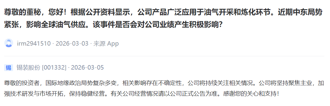 面对投资者提问,连日来多家上市公司通过互动平台、公告等多个渠道回应,一场由战火引发的“信息披露保卫战”,正悄然筑牢A股市场信心防线。全景为您精选来自上市公司最真实的声音。(以下内容均摘自深交所互动易、上证e互动、上市公司公告等,更多回应请点击:https://www.p5w.net/kuaixun/202603/t20260304_6440571.htm)