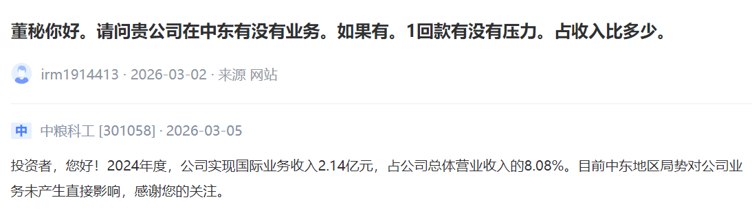 中粮科工 [301058] :2024年度,公司实现国际业务收入2.14亿元,占公司总体营业收入的8.08%。目前中东地区局势对公司业务未产生直接影响。