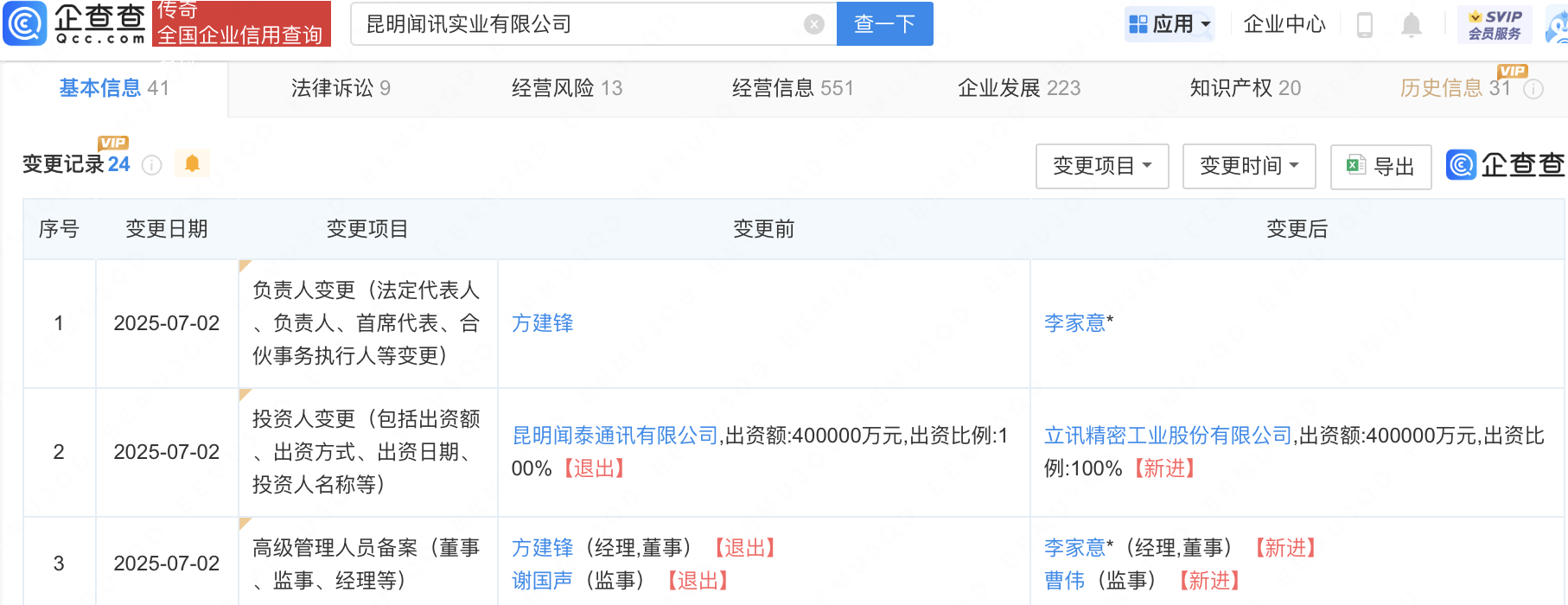 企查查APP显示,近日,昆明闻讯实业有限公司发生工商变更,闻泰科技(600745)旗下昆明闻泰通讯有限公司退出股东行列,新增立讯精密(002475)为股东并全资持股,同时,法定代表人及部分主要人员也发生变更。企查查信息显示,该公司成立于2020年,法定代表人为李家意,注册资本40亿人民币,经营范围含通信设备制造、移动终端设备制造、集成电路制造、集成电路芯片及产品制造等。