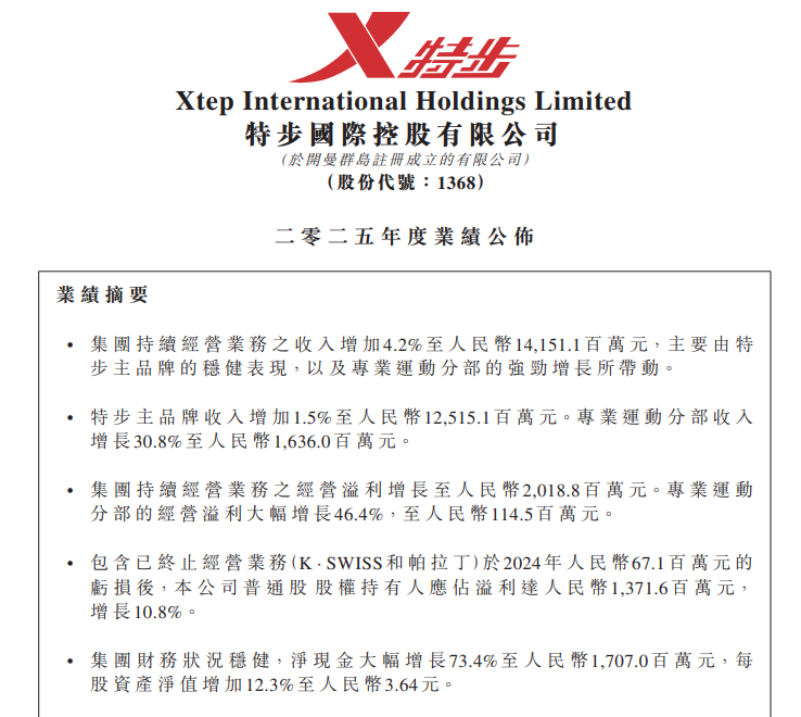 特步国际指出,2025年的业务收入增长,主要由特步主品牌的稳健表现,以及“专业运动分部的强劲增长”所带动。