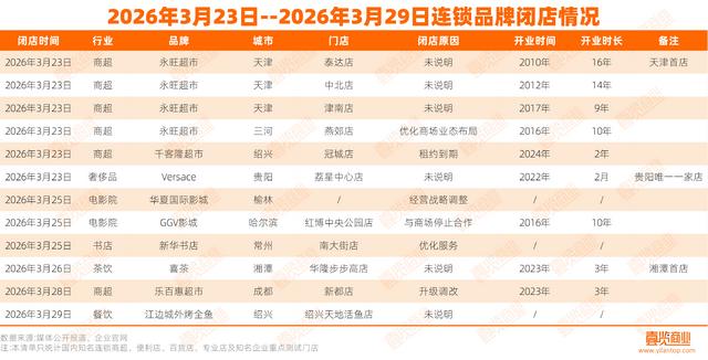 据壹览商业不完全统计,2026年3月23日——2026年3月29日,国内知名连锁超市、便利店、百货店、专业店及知名企业重点测试门店,共有9个连锁品牌关闭了至少12家门店。