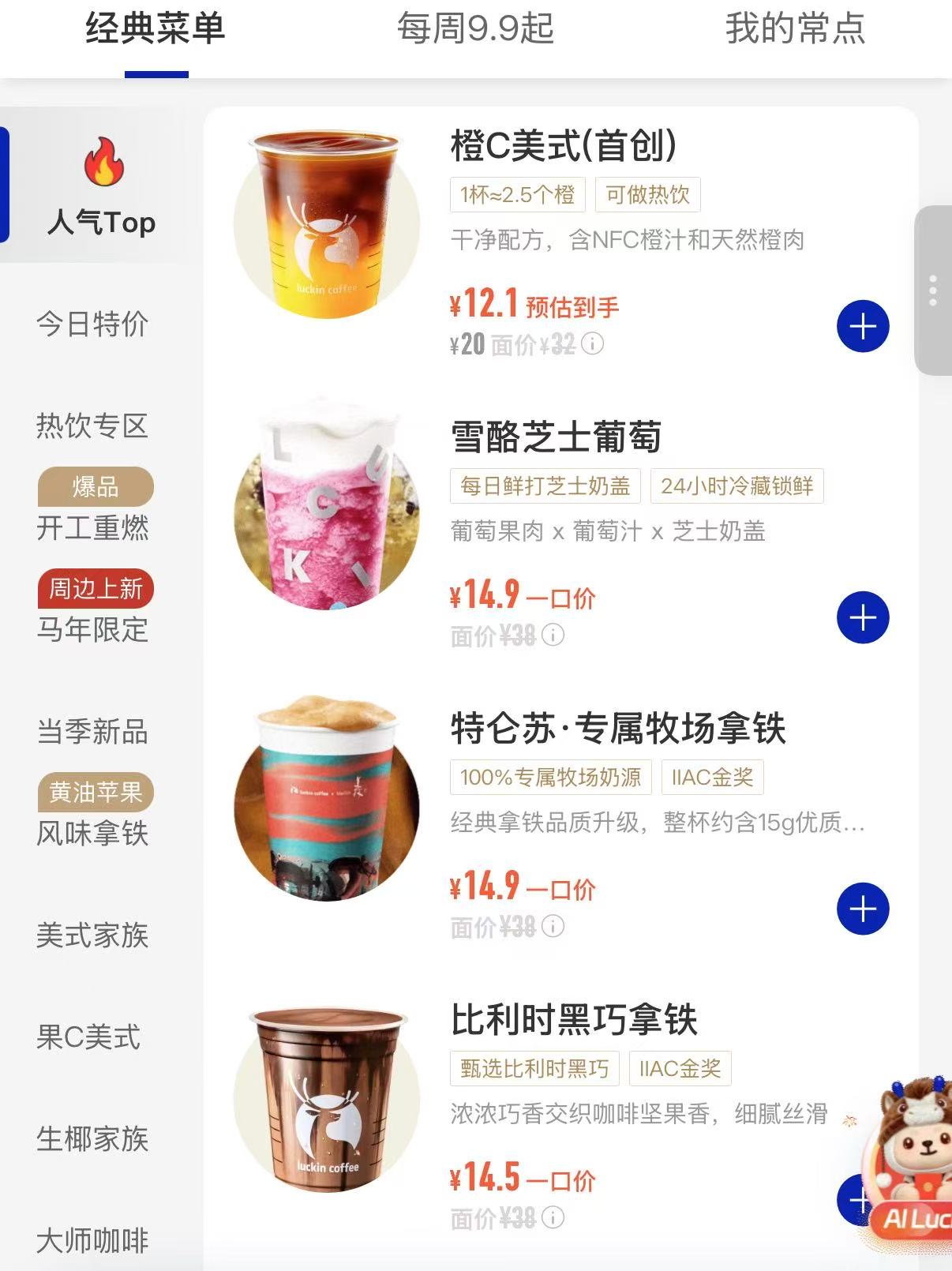 2月初,一直保持全场9.9元的库迪咖啡宣布收缩补贴范围,这意味着9.9块的咖啡再也不是库迪的常态。而瑞幸咖啡则在更早的时间就已经开始收紧9.9元券可用产品数量。蓝鲸新闻记者通过瑞幸咖啡在线点单系统查询发现,大部分饮品单价均位于13到16元价格带。用券后,9.9元单品仅为限定三款。