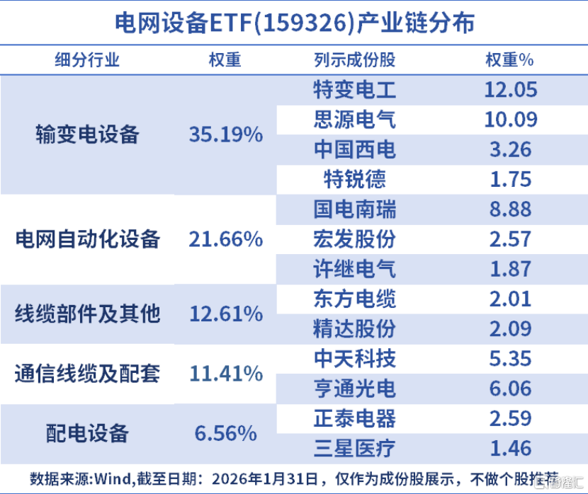通过观察电网设备ETF(159326)的行业分布变化,我们可以发现,特高压、配网智能化、储能配套等新兴业务的权重正在逐年提升,这与国家电网“十五五”投资重点高度一致。