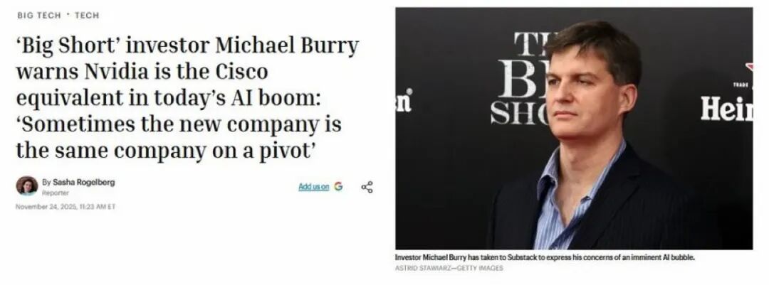 伯里曾多次将两者进行类比,认为英伟达和思科正处于人工智能泡沫的中心,这与互联网泡沫时代如出一辙。