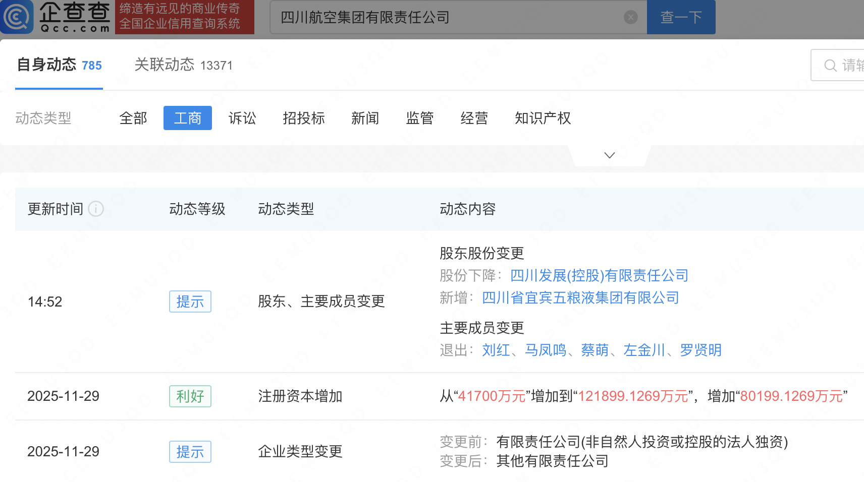 企查查APP显示,近日,四川航空集团有限责任公司发生工商变更,新增四川省宜宾五粮液集团有限公司为股东,同时注册资本由4.17亿元增至12.19亿元。企查查信息显示,该公司成立于1988年,法定代表人为李越,经营范围包含:通用航空服务;民用航空器维修;房地产开发经营等,现由四川发展(控股)有限责任公司、四川省宜宾五粮液集团有限公司共同持股。