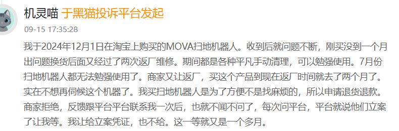 “实在不想再伺候这个机器了,我买扫地机器人是为了方便,不是找麻烦的。”在消费者服务平台黑猫投诉上,有消费者提到自己与MOVA扫地机器人之间的反复拉扯:我于2024年12月1日在淘宝上购买的MOVA扫地机器人。收到后就问题不断,刚买没到一个月出问题换货后面又经过了两次返厂维修。期间都是各种频繁手动清理,可以勉强使用。(2025年)7月份扫地机器人都无法勉强使用了,商家又让返厂……