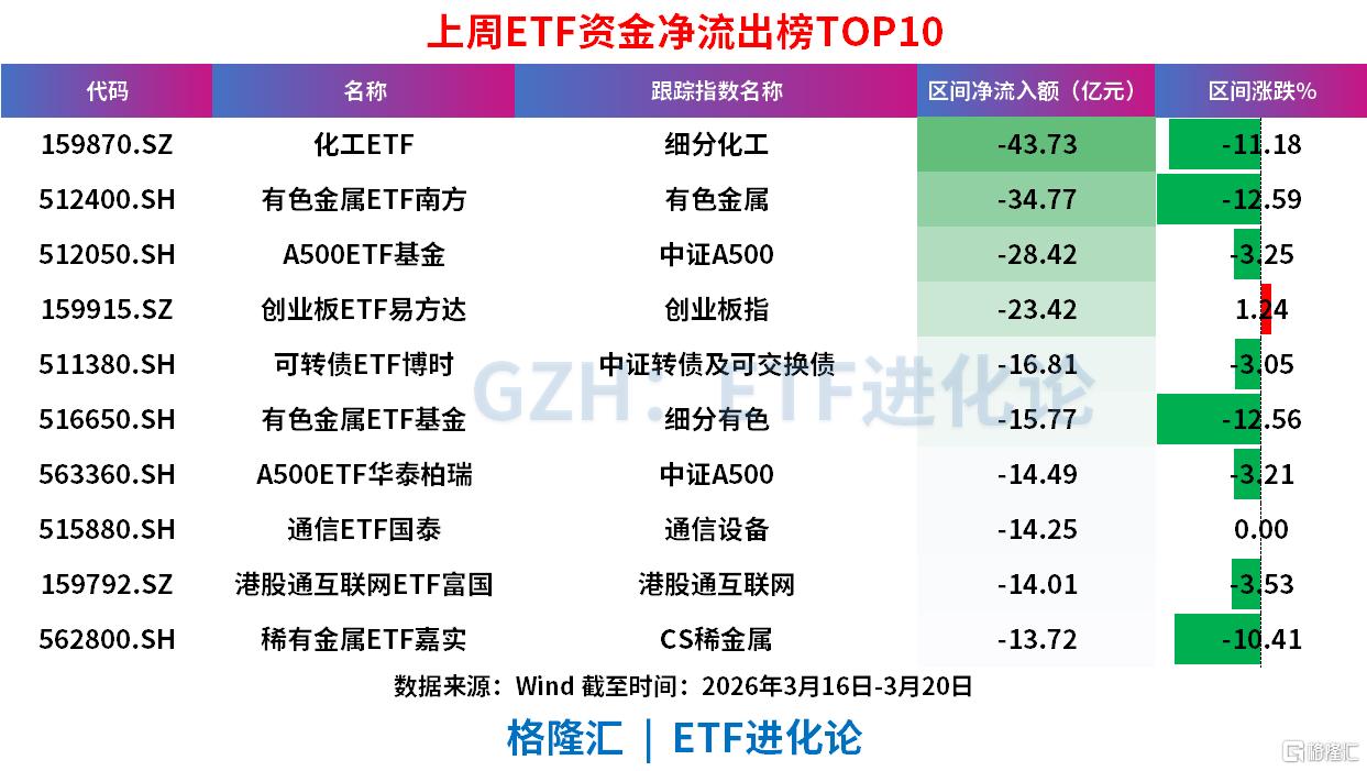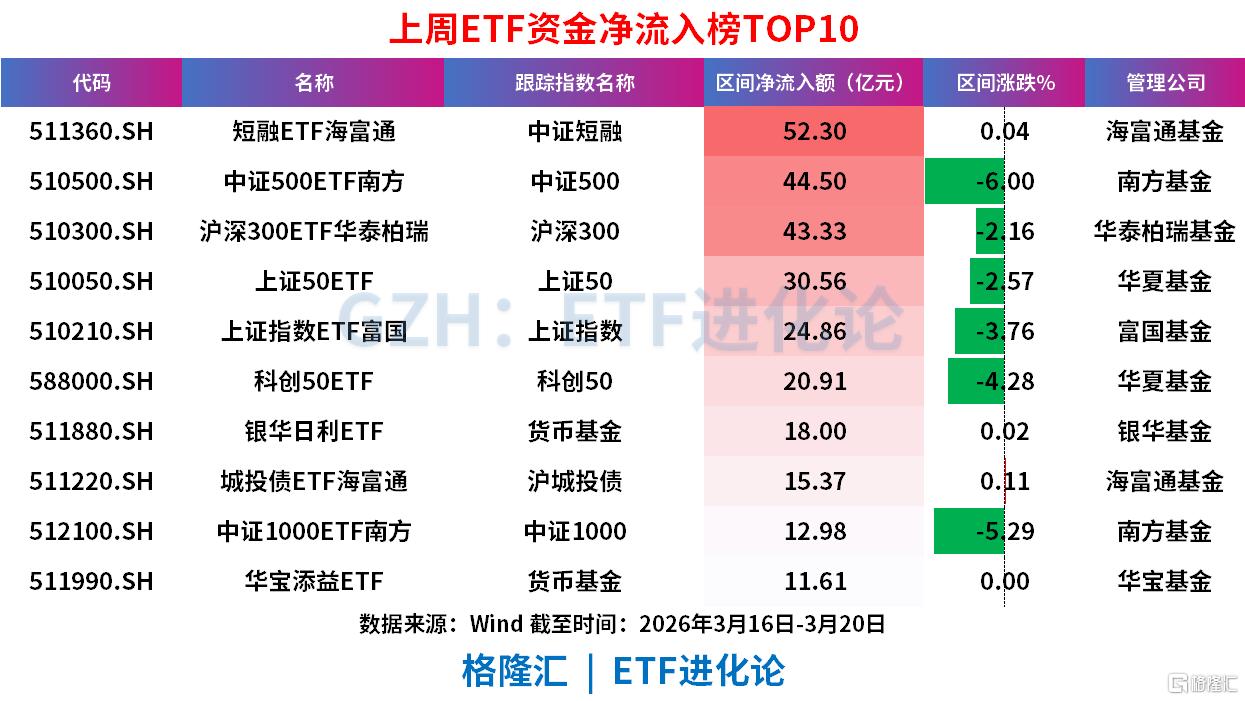 上周(3月16日-3月20日)ETF资金净流入呈现“固收+大盘宽基”的防御性配置特征: