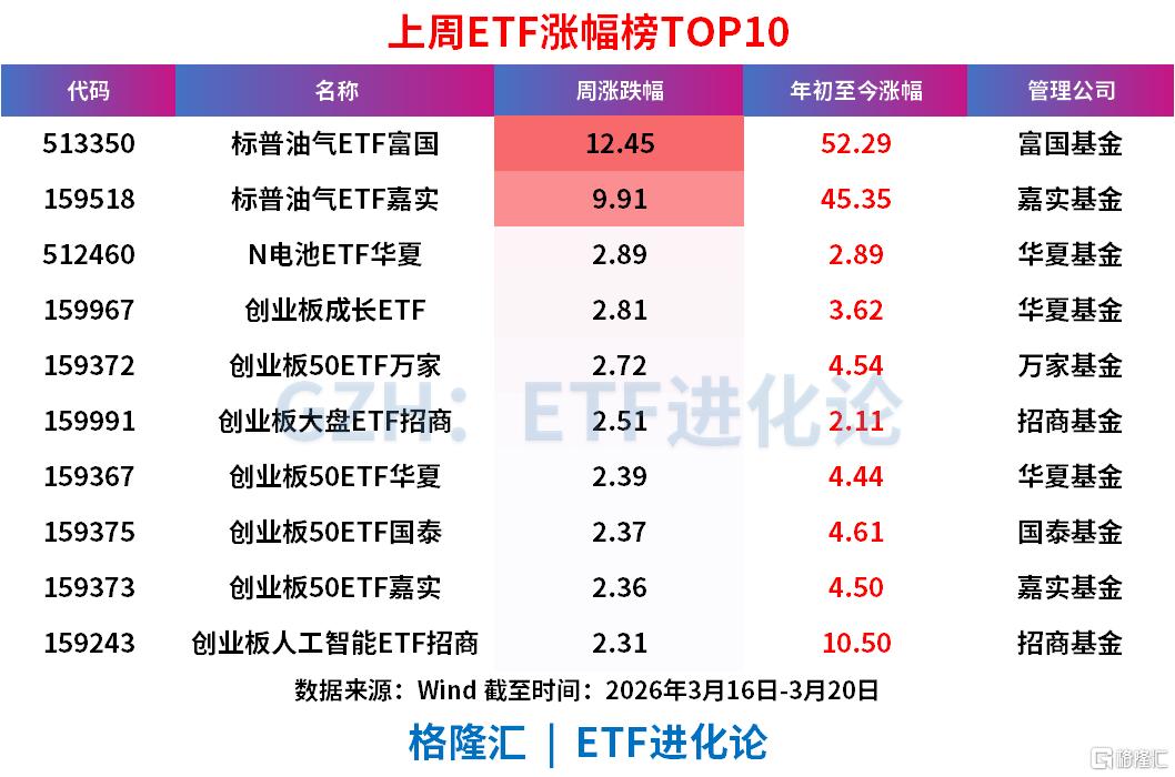 ETF涨跌幅呈现极端分化,标普油气一枝独秀,创业板相关ETF集体小幅跟涨;标普油气ETF:以12.45%和9.91%的周涨幅包揽前两名,年初至今涨幅分别高达52.29%和45.35%,是全市场最强主线。
