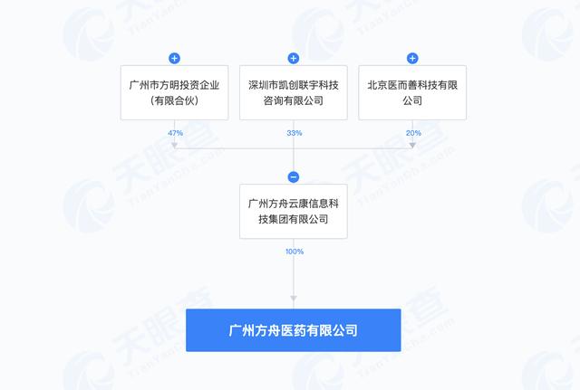 特别说明的是,方舟医药拥有互联网医院牌照。天眼查App信息显示,方舟医药成立于2019年8月,位于广东省广州市。目前,该公司的注册资本为2000万元,法定代表人为谢方敏,由广州方舟云康信息科技集团有限公司全资控股。
