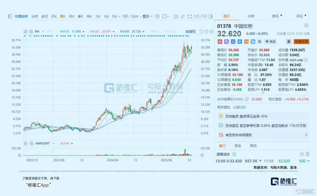 还有全球最大的一体化电解铝巨头中国宏桥(01378.HK)年内亦录得203.7%的涨幅,目前市值也已经突破3200亿港元,成为国内市值最大的铝业巨头。该股2024年139%涨幅,叠加起来近两年股价涨幅已高达6.2倍,但即使如此,该股的动态市盈率也仅有11.5倍左右,说明了公司股价的飙升背后有着强劲的业绩增长支撑。