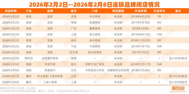 据壹览商业不完全统计,2026年2月2日——2026年2月8日,国内知名连锁超市、便利店、百货店、专业店及知名企业重点测试门店,共有6个连锁品牌关闭了至少23家门店。