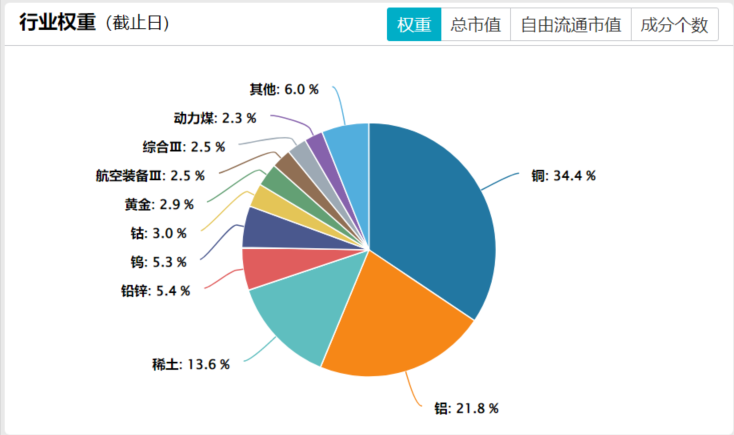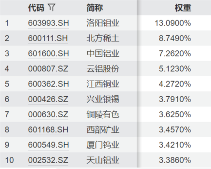 指数前十大成分股汇聚了各工业金属细分领域的绝对龙头,权重集中。前十大权重股合计占比达56.18%。
