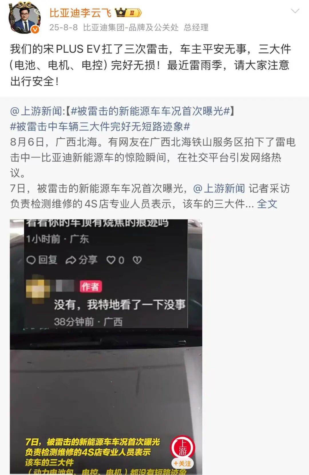 事发后,比亚迪品牌及公关处总经理李云飞公开表示,车辆扛了三次雷击,车主平安无事,三电系统完好无损。