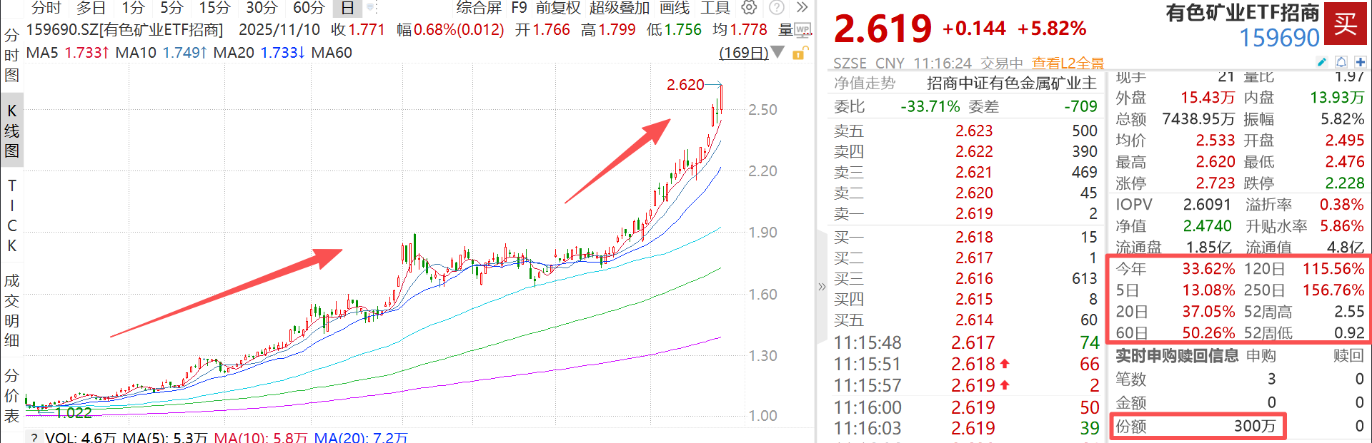 在昨日的短暂休息后,今日有色矿业ETF招商(159690)在黄金股、白银股的带动下再度火力全开,开盘后不断拉升现涨超5.8%,继续展示强势新高的态势,我们可以看到,今年以来,该ETF涨幅高达33.62%,近250日累计涨幅更是超156%。而且在这么大的涨幅面前,该ETF今日盘中继续获300万份额的净申购,可见资金对该板块的后市看好程度是有多么热烈。