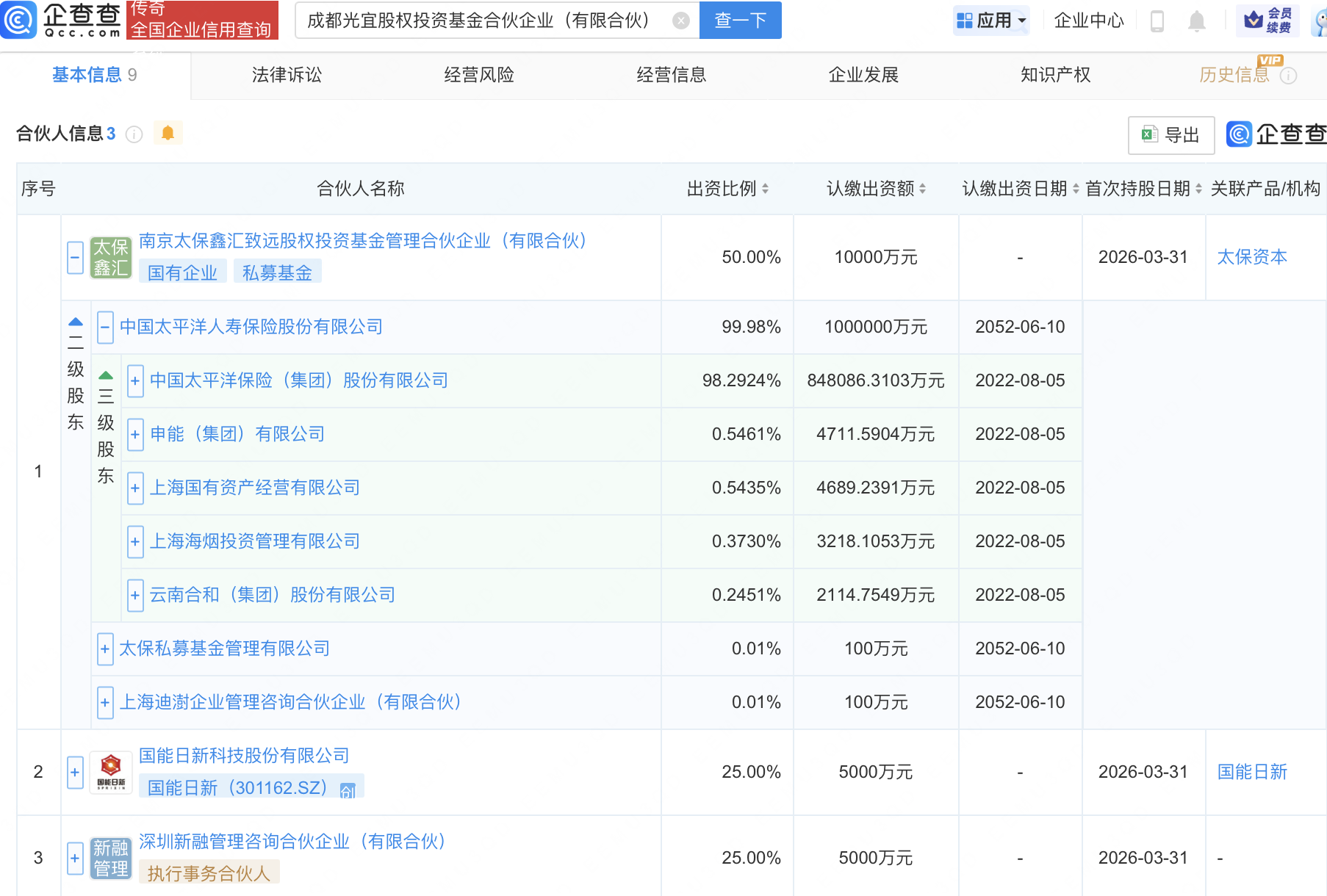 企查查APP显示,近日,成都光宜股权投资基金合伙企业(有限合伙)成立,出资额2亿元,经营范围包含:以私募基金从事股权投资、投资管理、资产管理等活动。企查查股权穿透显示,该企业由中国太保(601601)旗下南京太保鑫汇致远股权投资基金管理合伙企业(有限合伙)、国能日新(301162)等共同出资。