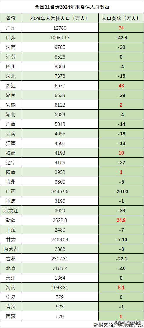 当前,全国人口增长较快的省份多集中在沿海地区。2024年,广东省常住人口增长74万人、浙江省增长43万人、福建省增长10万人,均位居全国前列。作为我国“一带一路”战略窗口的新疆,2024年常住人口也增长了24.8万人。