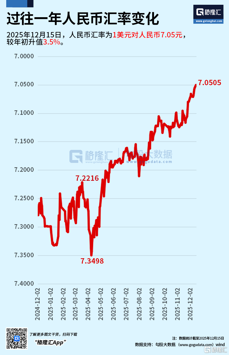 2025年以来,人民币对美元汇率持续走强,11月下旬在岸与离岸汇率双双突破7.08关口,创下逾一年新高。12月,人民币继续走强,在岸、离岸价双双击穿7.05。