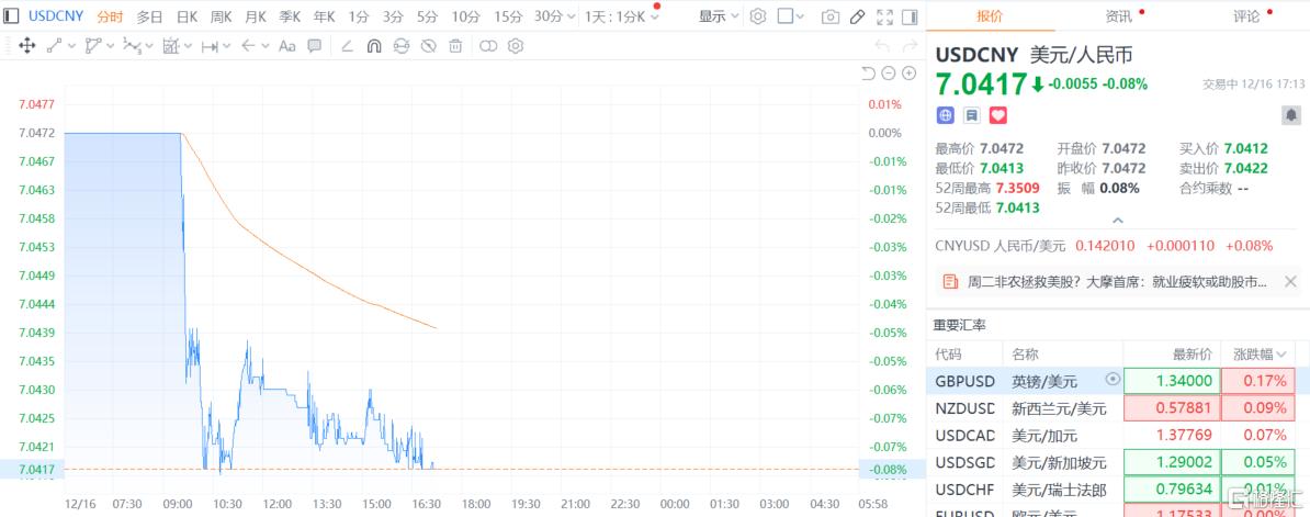 今日(12月16日),在岸、离岸人民币对美元汇率再次走强。