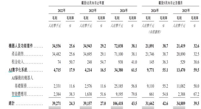 毛利率的持续改善更能说明问题。2022年至2024年,云迹科技整体毛利率从24.3%提升至43.5%,三年提升19.2个百分点。这一改善主要来源于两方面:一是规模效应带来的硬件成本下降,二是高毛利软件业务占比提升。2024年,AI数字化系统业务毛利率高达61.5%,而机器人硬件毛利率为38.1%。