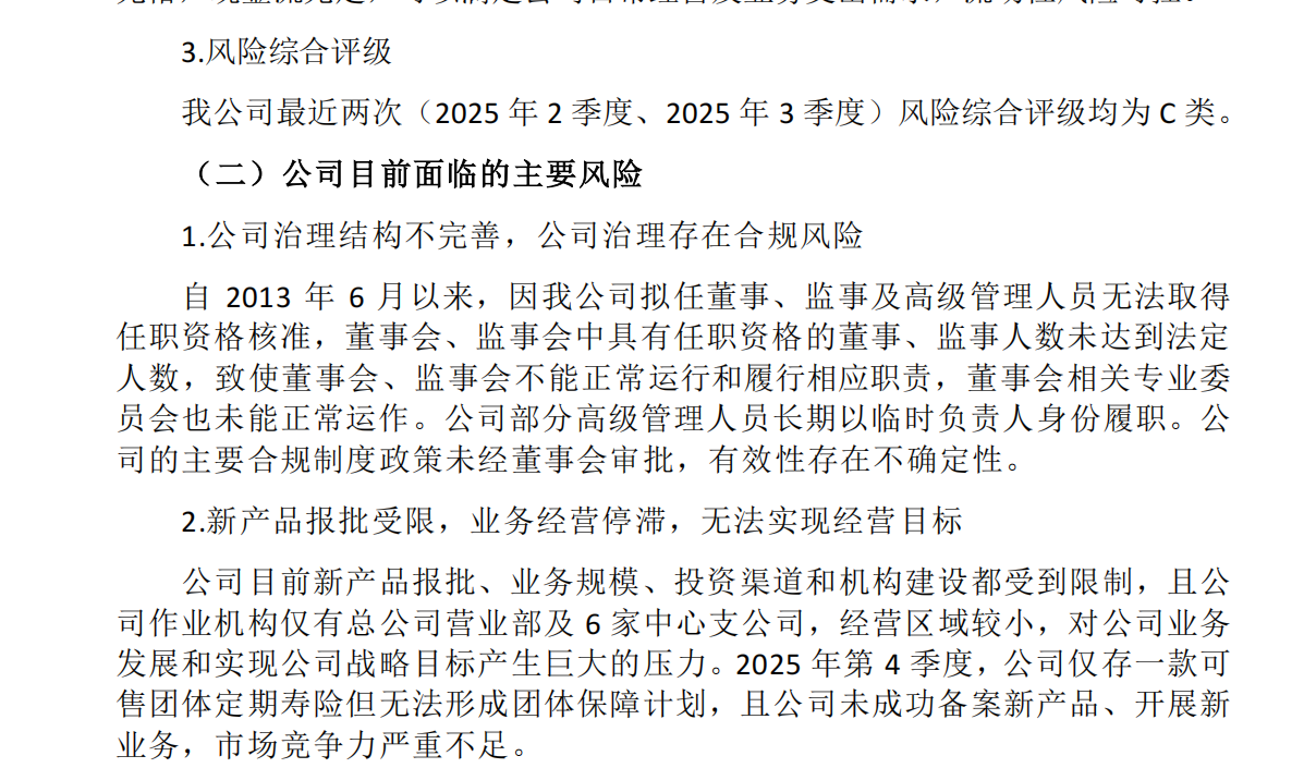 值得关注的是,华汇人寿2025年业绩表现亦不尽人意,揽收保费0.01亿元、净亏损0.71亿元,偿付能力“亮红灯”,风险综合评级结果为C类。华汇人寿坦言,公司目前面临的主要风险有两点:一是公司治理结构不完善,公司治理存在合规风险;二是新产品报批受限,业务经营停滞,无法实现经营目标。