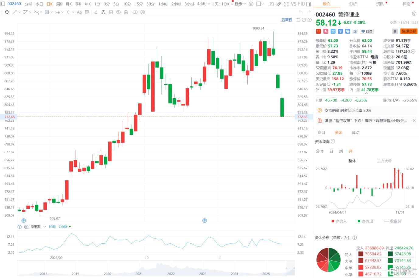 截至发稿,赣锋锂业H股大跌近8%报46.88港元;A股大跌9.39%报58.12元,总市值1198.23亿元。