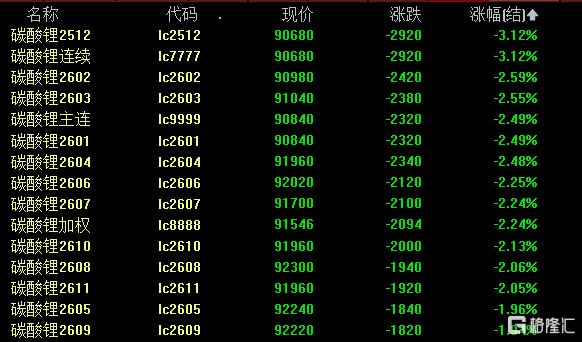 今日,碳酸锂多期货再度全线下挫。碳酸锂连续主力合约日内跌超3%,现报90680元/吨。