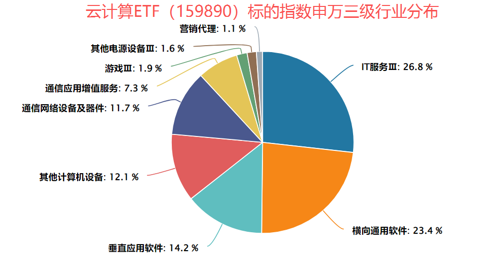 数据显示,云计算ETF(159890)跟踪云计算(930851.CSI),对计算机软件、云服务、计算机设备、通信设备等领域布局全面、成份股软硬件协同。具体来看,指数成份中,IT服务+横向通用软件+垂直应用软件三大行业合计占比约65%,对AI应用有深度布局,或为AI大时代一站式解决方案。