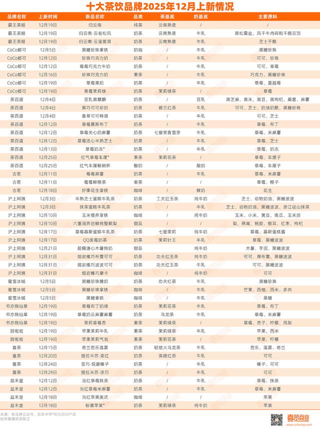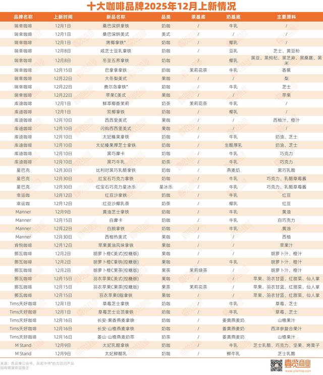 咖啡品牌方面,12月共推出22款奶咖新品(含2款回归),占咖啡品牌新品总量55%;共上新10款果咖产品,占咖啡品牌新品总量的四分之一;果茶、奶茶、轻乳茶等品类也有上新,拓宽了边界。