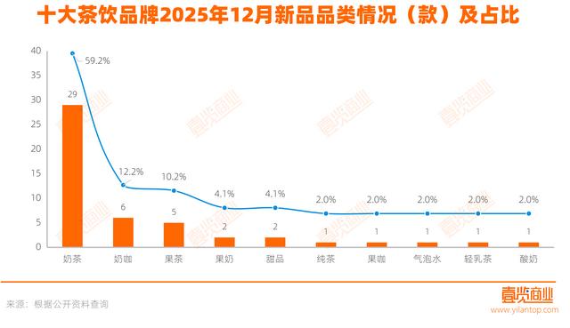 茶饮品牌方面,共上新30款奶茶,占比63.8%;奶咖与果奶则是另外两个重要组成部分,合计近25%;而果奶、甜品、纯茶、气泡水等产品也有上新,为消费者提供了丰富的选择。