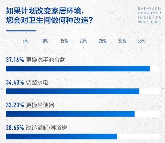 第一财经发布的《2025卫浴消费趋势白皮书》显示,1351位受访者中与调整水电布局、更换坐便器、改造浴缸/淋浴房有关的需求占比分别高达34.43%、33.23%和28.65%,卫浴空间升级的普遍趋势,呼唤着供给端的服务升维。