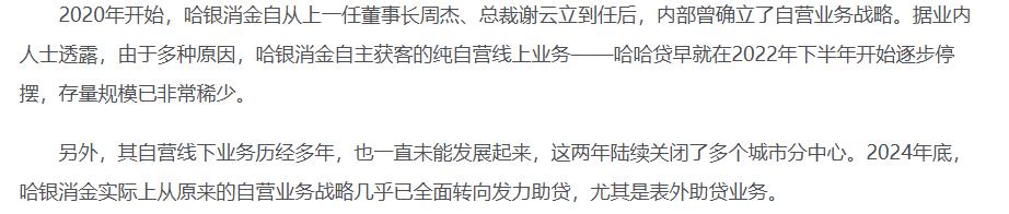 在时任董事长周杰和总裁谢云立的领导下,哈银消金确立了发展自营业务的战略方向。然而,这一战略并未能持续深入推进。据《智瑾财经》报道,有业内人士透露,哈银消金自主获客的纯自营线上产品——“哈哈贷”早在2022年下半年就开始逐步停摆,存量规模已非常稀少。同时,其自营线下业务也发展不顺,近年来陆续关闭了多个城市分中心。