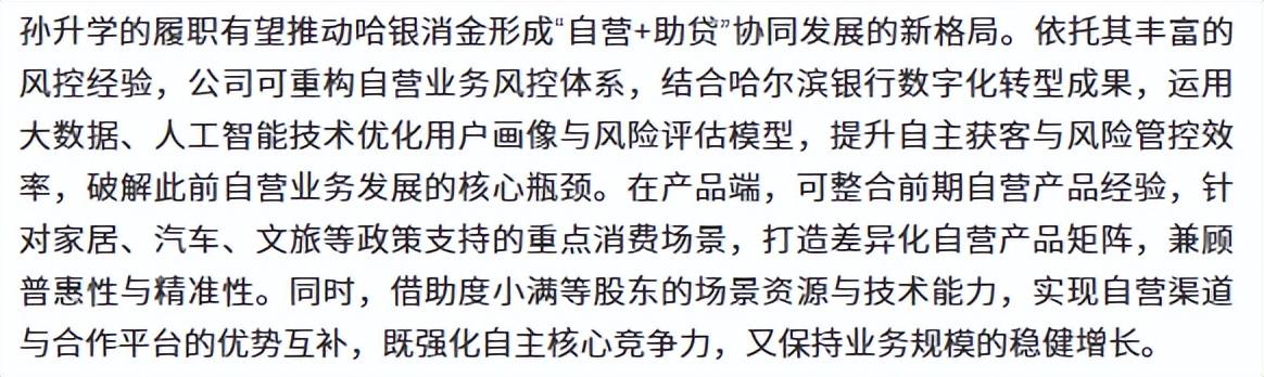 此外,孙升学在哈尔滨银行多个关键部门的任职经历,使其具备强大的内外部协调能力。这种能力在平衡母行、互联网股东及其他利益相关方期望方面至关重要。特别是在推动自营业务重启过程中,如何有效整合母行哈尔滨银行的资金与客户资源,以及度小满等互联网股东的流量与技术优势,将直接影响到哈银消金战略转型的成效。