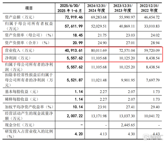 2022年、2023年、2024年、2025年1-6月(报告期),天溯计量的营业收入分别为5.97亿元、7.26亿元、8亿元、4.09亿元,净利润分别为8438.54万元、1.01亿元、1.11亿元和5557.62万元。